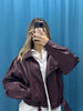 Giubbotto in pelle bordeaux, dal taglio deciso e moderno. Morbido e versatile, perfetto per look grintosi e contemporanei.