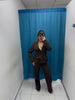 Tailleur in marrone caldo, con nodo frontale regolabile per evidenziare la vita e valorizzare la silhouette.