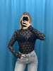 Maglia in pizzo nero semi-trasparente dal design raffinato e sensuale. Il motivo geometrico all-over crea un elegante gioco di trasparenze, mentre il collo alto e le maniche lunghe bilanciano il look con un tocco sofisticato. Vestibilità aderente che valorizza la silhouette, perfetta da indossare con un top o un bralette sotto per un outfit serale deciso, oppure con un blazer per uno stile chic e contemporaneo.