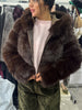 Avvolgiti nel calore avvolgente della Cocoa Cloud, la pelliccia crop marrone con cappuccio che unisce morbidezza e stile in un unico capo irresistibile.