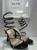 Tacchi neri eleganti con rivestimento superiore in argento lucido che cattura la luce ad ogni passo. Le sottili fasce si attorcigliano delicatamente intorno alle caviglie, creando un effetto sinuoso e raffinato. Il tacco è di altezza media, perfetto per slanciare la figura mantenendo comfort e stabilità. Ideali per look serali o outfit sofisticati con un tocco brillante.